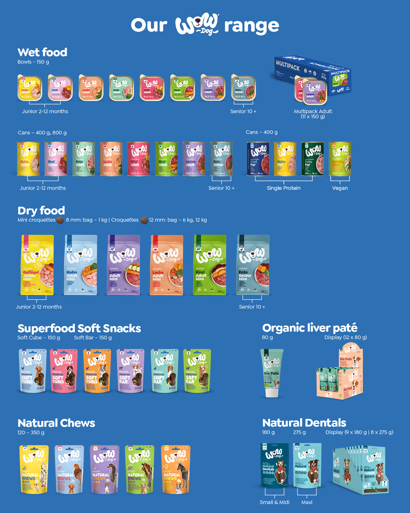 The diversity of the WOW range is made possible thanks to our long-standing regional businesses partners, whose co-operation with PetCo GmbH we truly value. WOW DOG's wet and dry food and snacks are produced 100% in Austria, with preference given to local and seasonal ingredients, packaged as sustainably as possible and with continuous efforts to reduce our carbon footprint. WOW is simply good for everyone – people, animals and the planet. Simply WOW!