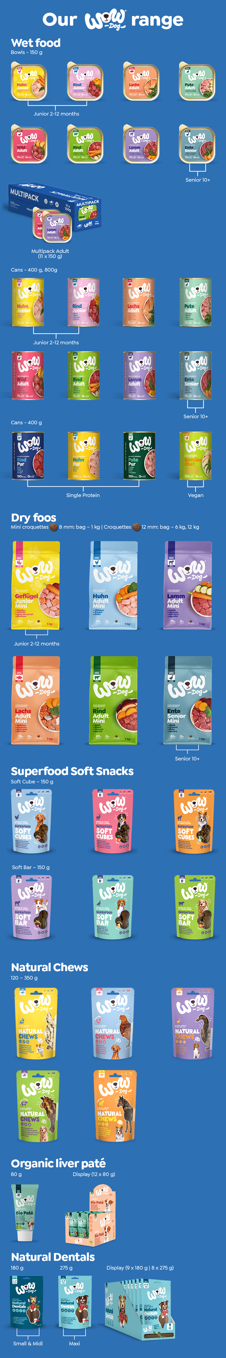 Healthy dog nutrition is also a top priority at WOW. Our menus are rich in high-quality protein, fresh fruit and vegetables as well as valuable oils and essential nutrients. At WOW, we never use artificial additives, flavour enhancers, sugar or cereals. The friendly, colourful design speaks for itself: WOW on the outside and WOW on the inside!